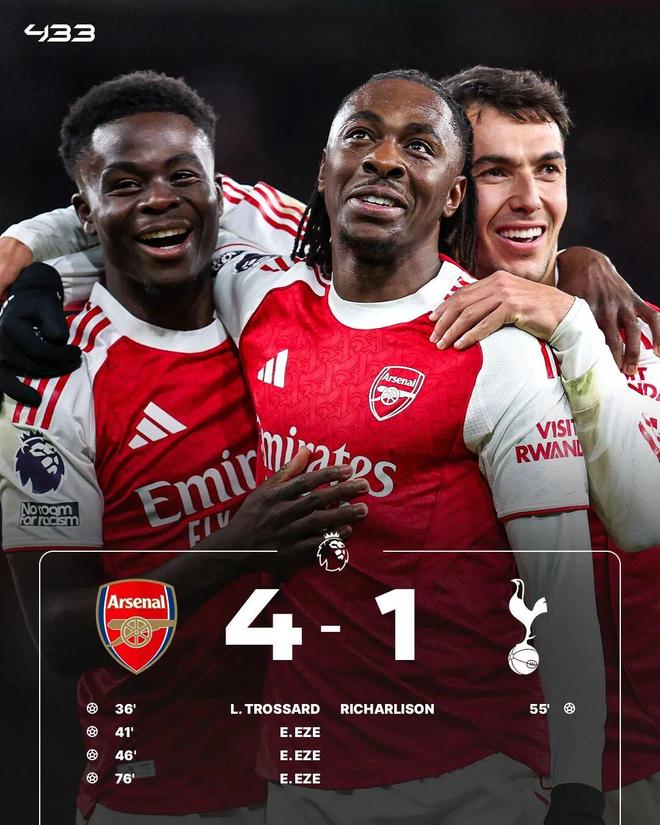最终,枪手主场4-1大胜热刺,各项赛事15场保持不败。