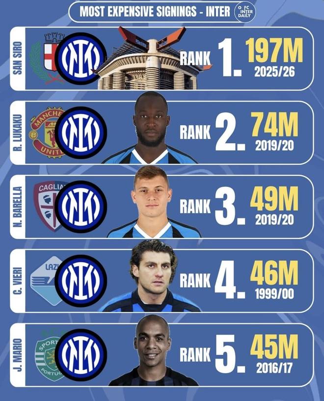 最近FC Inter Daily发布了“国际米兰最贵引进榜”。图中列出四笔高价交易:卢卡库7400万欧、巴雷拉4900万欧、维埃里4600万欧、马里奥4500万欧,时间从1999/2000到2019/2020,位置覆盖中锋与中场。下面就按球员逐一回看出勤、产出与去留,结合转会费还原这几笔的性价比。
