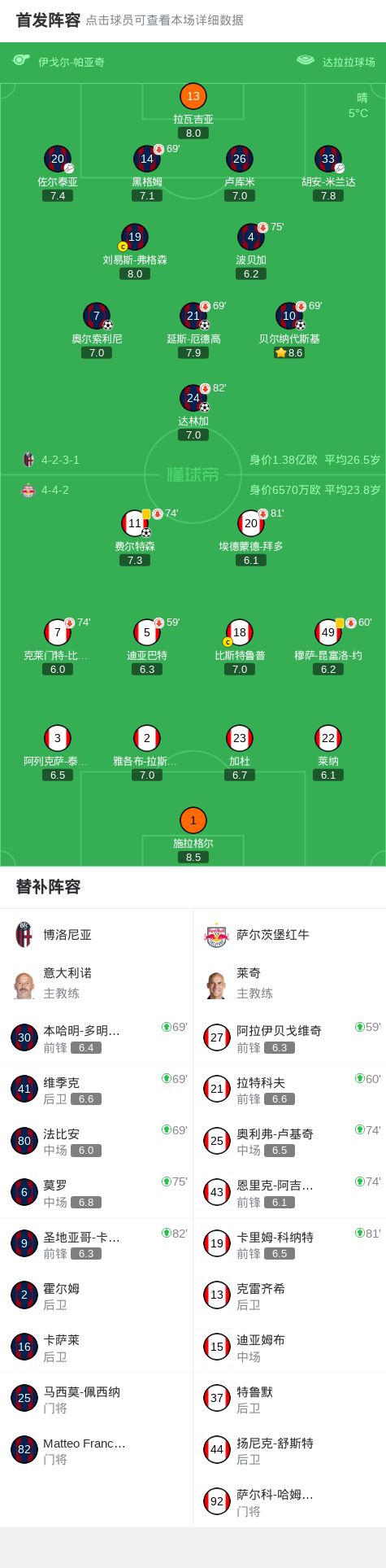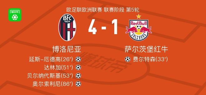博洛尼亚4-1大胜萨尔茨堡红牛,奥尔索利尼、贝尔纳代斯基建功