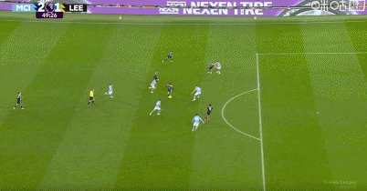 第67分钟,曼城后防再次送礼,这次利兹联右路快速反击,又是勒温,他接博格头球摆渡,冲入禁区抢球时被回防的格瓦迪奥尔飞身铲倒。主裁果断颁发了黄点套餐,恩梅查操刀主罚被门将多纳鲁马神勇扑出,恩梅查机敏跟进补射得手,利兹联2:2扳平比分。被连追2球的曼城如梦方醒,随后再展开猛烈攻势,第72分钟,曼城左路压上,多库突入禁区下底倒三角横传门前,佩里奋力一扑,他身后回防过来的斯特鲁伊克解围失误,差点将球送入自家网窝,最后皮球是擦着门柱出了底线。直到补时阶段曼城才再次抓住机会,曼城右路压上,替补登场的谢尔基禁区边上接球往里突破后横传,福登接球持续横切摆脱3人防守后半转身左脚大力低射,皮球直入球门右下死角,福登梅开二度,曼城3:2绝杀利兹联。