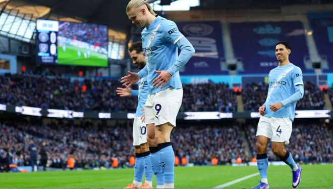 各项赛事7连胜!英超:曼城3-0西汉姆联先赛暂登顶 哈兰德2射1传