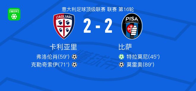 北京时间12月21日意大利足球顶级联赛 联赛 第16轮,卡利亚里主场对阵比萨。卡利亚里弗洛伦肖破门,克勒奇索伊破门。比萨特拉莫尼破门,莫雷奥破门。最终比分卡利亚里 2-2 比萨。