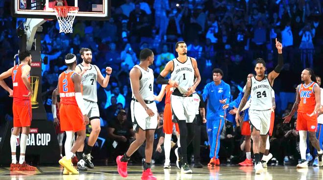 北京时间12月17日,NBA杯赛迎来尼克斯和马刺的冠军赛。在杯赛的半决赛中,伤愈复出的文班亚马虽受登场时间限制,却用统治级表现带领马刺以111-109险胜雷霆,不仅终结对手的16连胜,还率队挺进决赛。本场比赛,文班亚马出战不足21分钟,却高效砍下22分9篮板2盖帽的高光数据。尤其是在在决胜的第四节,他多次凭借恐怖的身体天赋完成关键攻防,成为球队逆转取胜的核心功臣。除了文班的惊艳发挥,马刺的阵容深度也展现得淋漓尽致 —— 卡斯尔、福克斯与瓦塞尔三位球员同步爆发,均砍下20 +得分,多点开花的进攻体系让雷霆的防守顾此失彼。