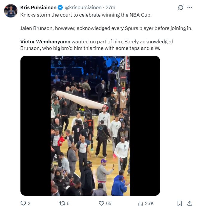 比赛结束后尼克斯核心杰伦-布伦森走向马刺替补席,他跟每一位马刺球员握手致敬,但根据尼克斯现场记者Kris Pursiainen的报道,马刺全队都跟布伦森握手,维度文班亚马根本不理睬布伦森。