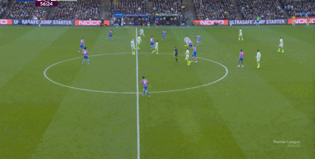 这使得水晶宫错过了他们的最好的战机窗口,因为体能问题即将找上门来,于是在此之后,水晶宫再无快速反击和进攻的机会,反倒是曼城,通过贝尔纳多-席尔瓦的牵制,暴露出了右侧禁区角的空间,找到了中场出身的努内斯,为后点的哈兰德送上了传中:
