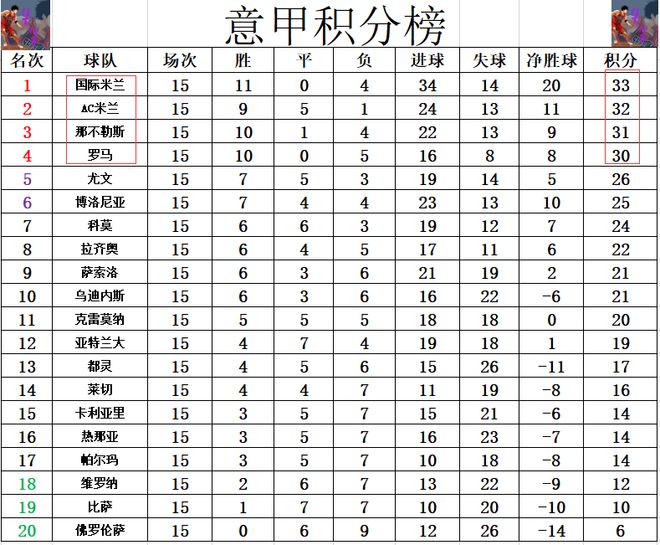 积分榜方面,罗马小胜黑马赢球后,加入争冠行列,还是落后国米3分,现在从国米,AC米兰,那不勒斯到罗马,四队依次1分只差从第1排到第4。第5的尤文落后的稍微多一些,尤文差国米7分,少罗马4分。